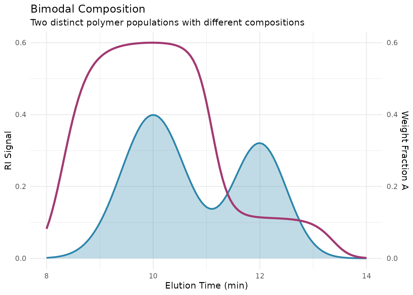 Beyond drift, copolymers can also show compositional distribution—random variation in composition at each molecular weight. Block copolymers, gradient copolymers, and statistical copolymers each have distinct compositional signatures that SEC with dual detection can reveal.