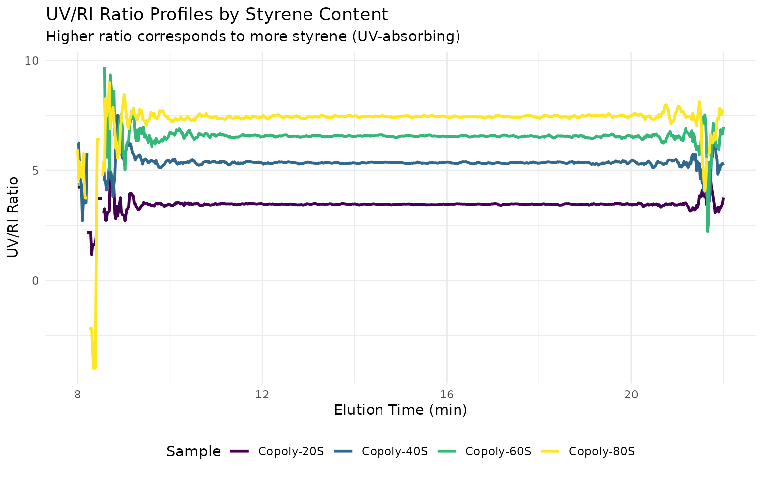 title = "UV/RI Ratio Profiles by Styrene Content",