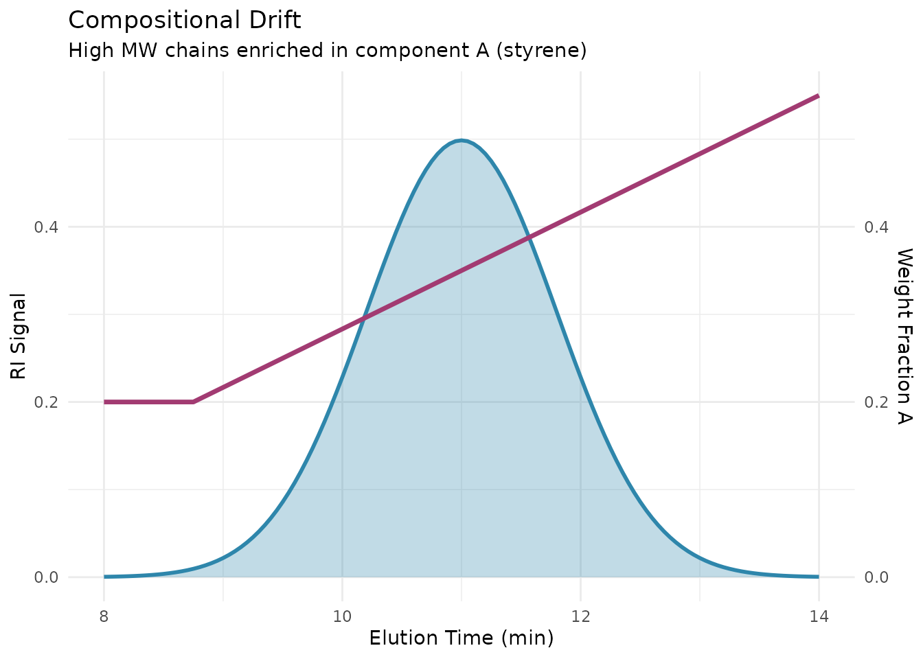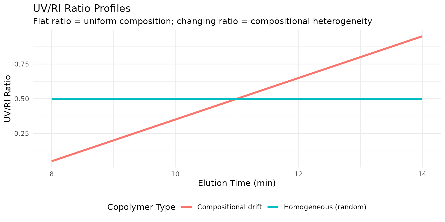 This drift creates a correlation between MW and composition. In SEC, higher MW chains elute first. If these high MW chains were formed when the reactor was enriched in one monomer, they will have higher content of that monomer. The UV/RI ratio across the chromatogram directly reveals this variation.