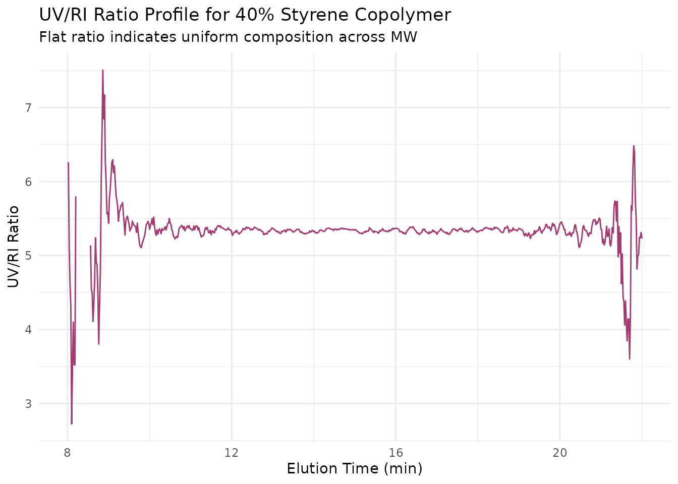 The UV/RI ratio method provides a powerful, accessible approach to compositional analysis when one monomer absorbs UV light and the other doesn’t. The ratio of UV to RI signal at each elution slice reflects the local composition. A flat ratio indicates uniform composition; a changing ratio reveals heterogeneity.