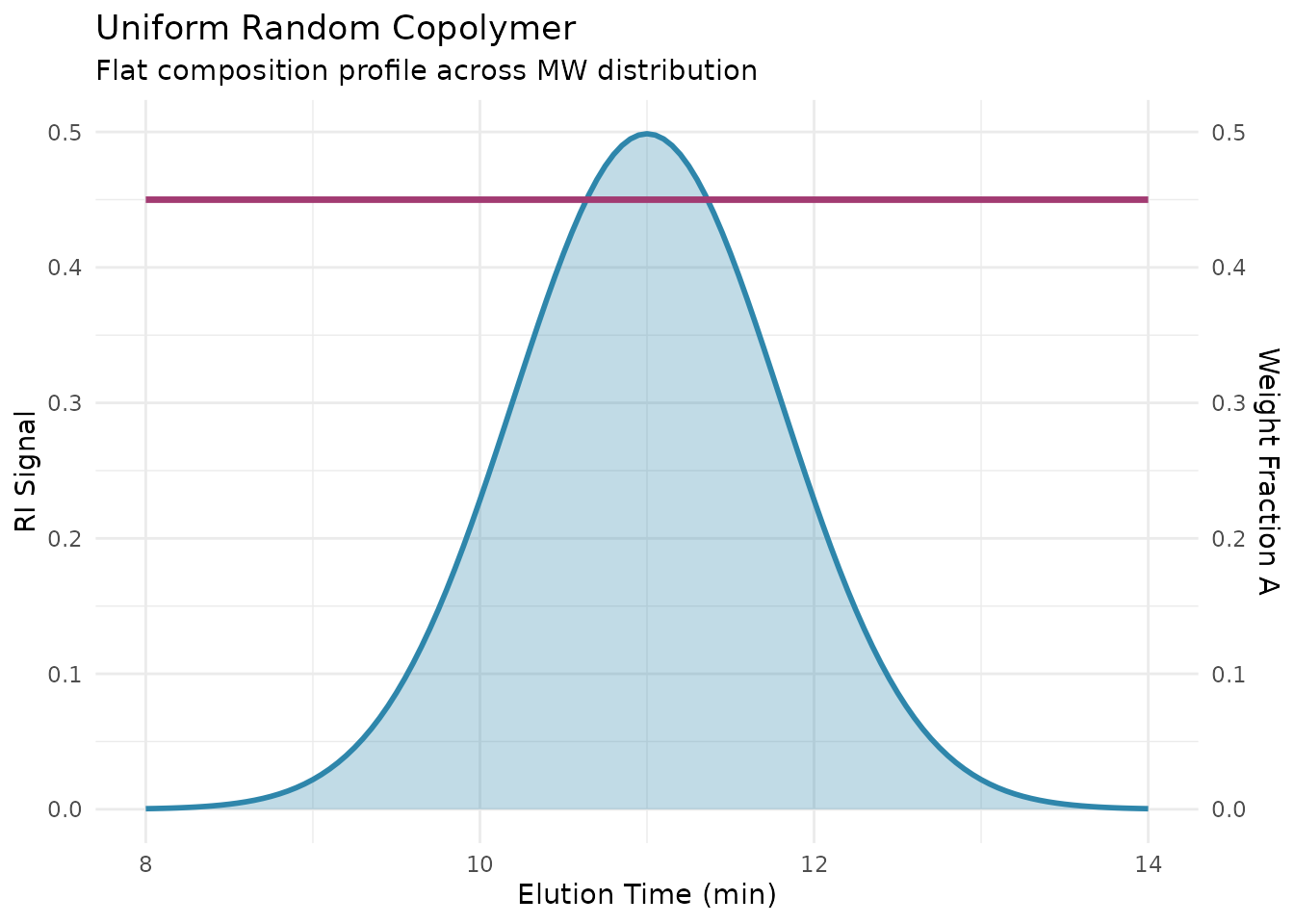 Characteristics: - Constant UV/RI ratio - Flat composition profile - Indicates random or alternating copolymer