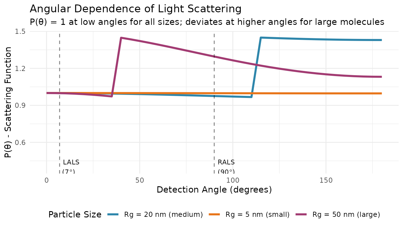 Key insight: At low angles (approaching 0°), P(θ) → 1 regardless of particle size. This is why LALS can measure MW without knowing Rg.