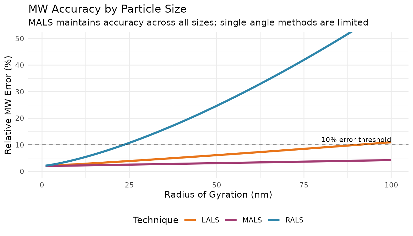 For small molecules where Rg << λ/20 (roughly Rg < 15 nm at 670 nm), the angular dependence is minimal and RALS provides reasonable MW estimates.