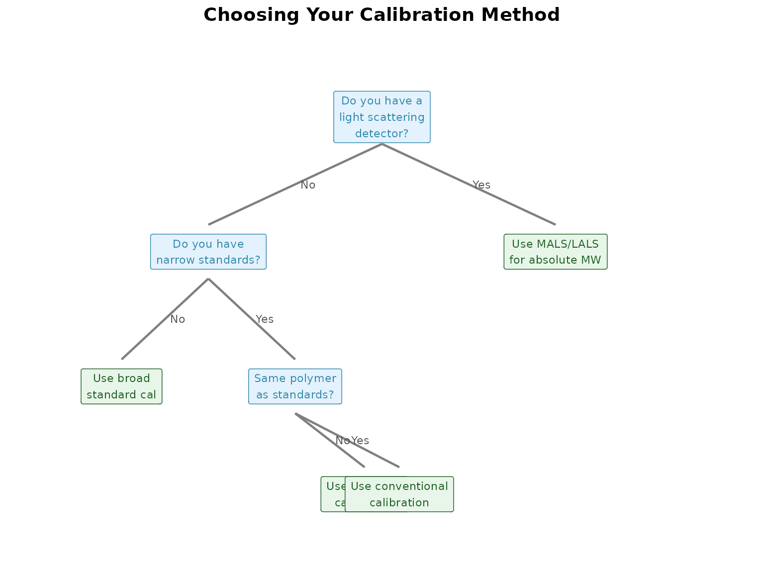 Calibration converts elution time to molecular weight. The right approach depends on your standards and goals: