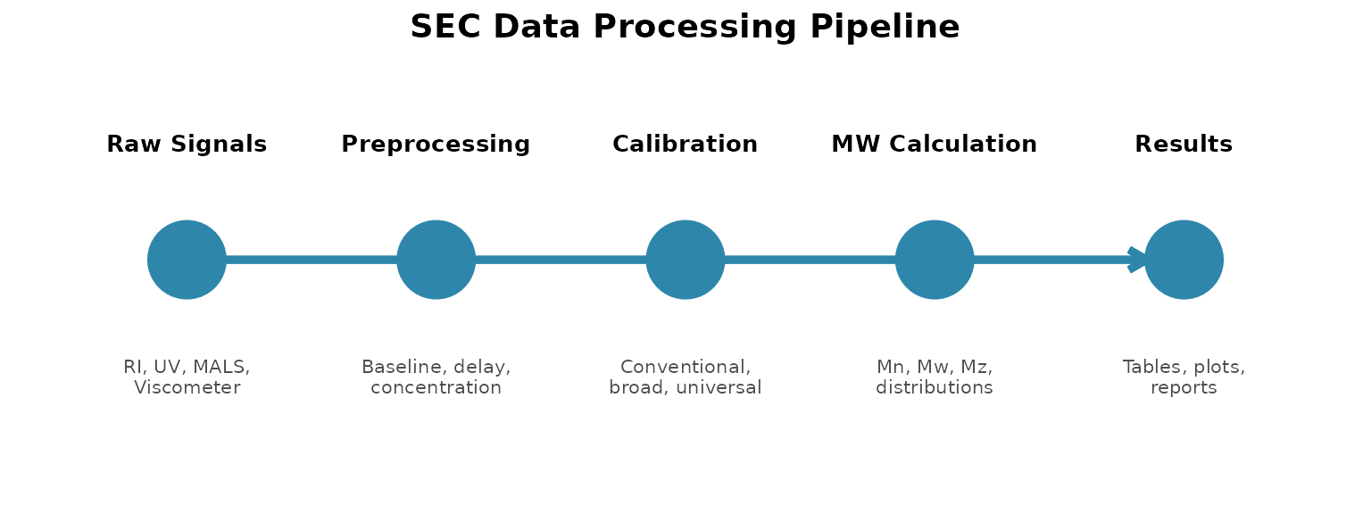 SEC data processing follows a consistent pattern: raw detector signals are converted to a common format, processed to remove artifacts, calibrated to molecular weight, and then used to calculate results. Understanding this flow helps you build recipes that make sense.