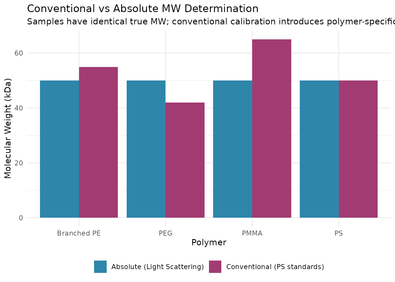 The problem is that SEC separates by hydrodynamic volume—how much space a molecule occupies in solution—not by molecular weight directly. A compact, branched polymer with MW = 100,000 Da might elute at the same time as a linear polymer with MW = 50,000 Da simply because they occupy similar volumes. Conventional calibration cannot distinguish between them.