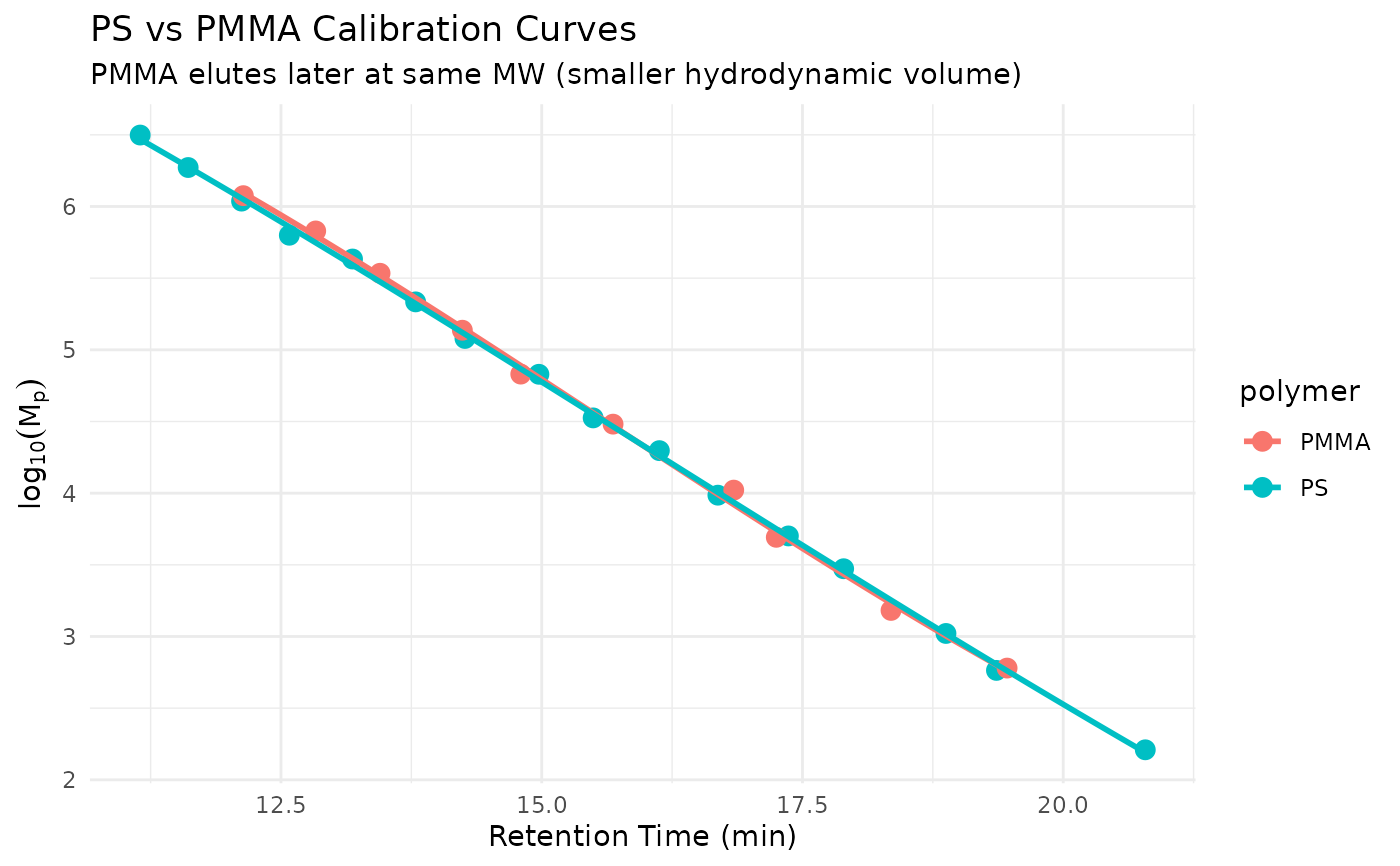 subtitle = "PMMA elutes later at same MW (smaller hydrodynamic volume)"