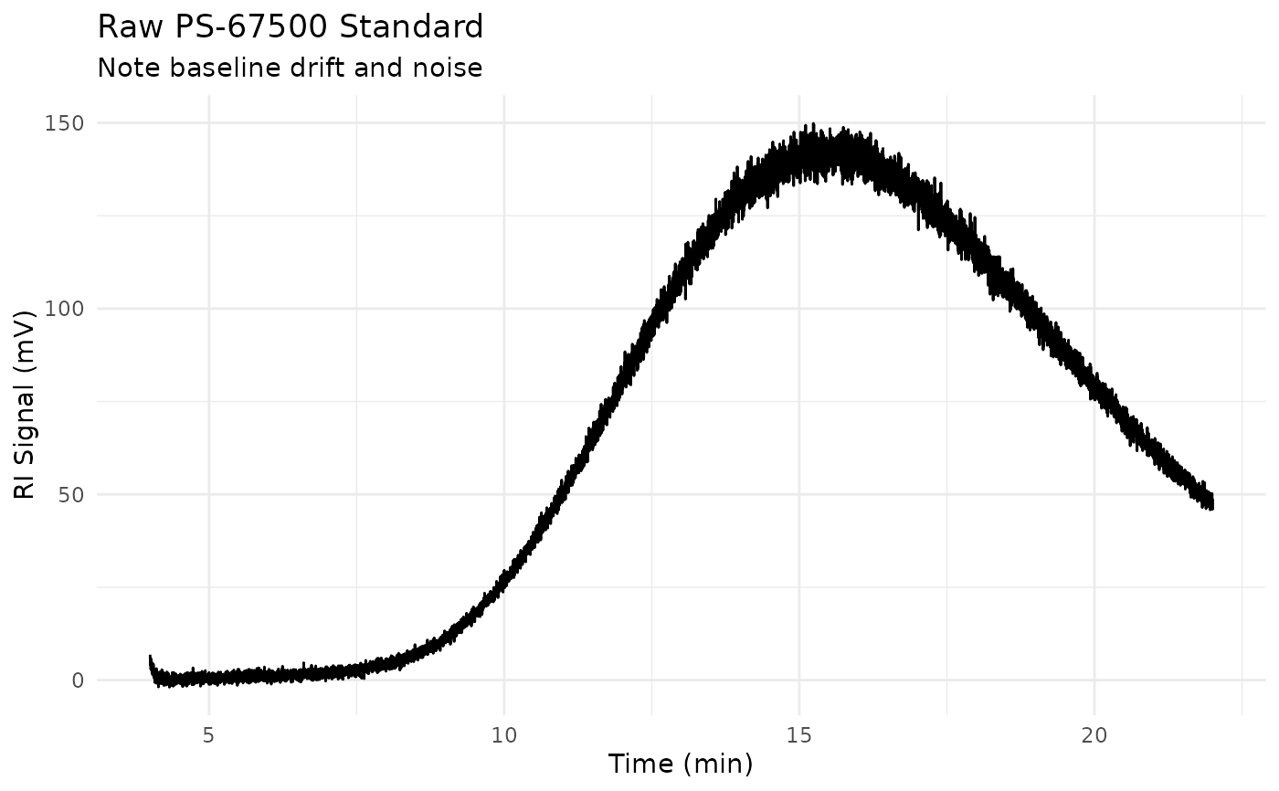 A dataset containing raw SEC chromatograms of polystyrene narrow standards with realistic noise, baseline drift, and injection artifacts. Designed to mimic data exported directly from SEC instruments for tutorial purposes.