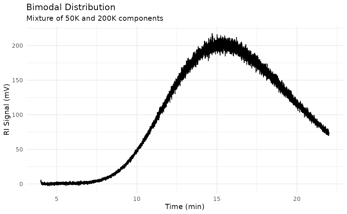 A dataset containing raw SEC chromatograms of polymer samples with known true molecular weight values for validation. Includes challenging cases like bimodal distributions and high molecular weight aggregates.
