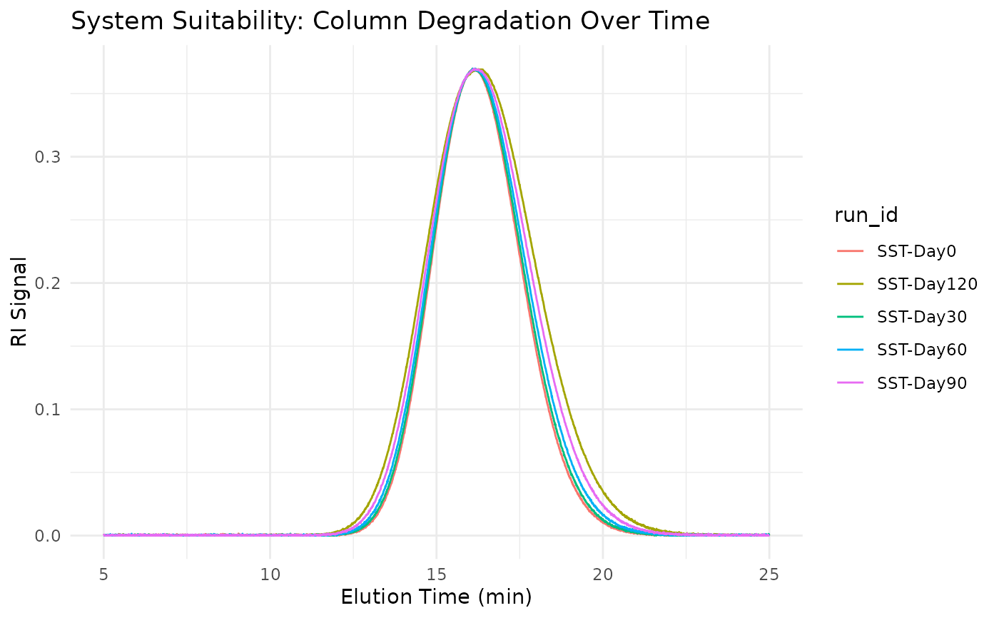 A synthetic dataset containing SEC system suitability test (SST) runs showing column degradation over time, useful for QC testing and demonstrating column performance metrics.