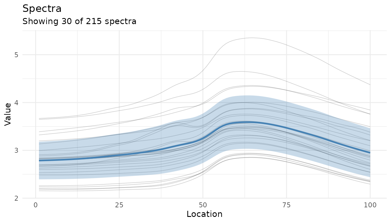 autoplot(baked$.measures, summary = TRUE, max_spectra = 30, alpha = 0.2)
