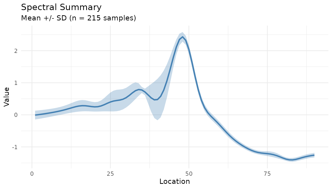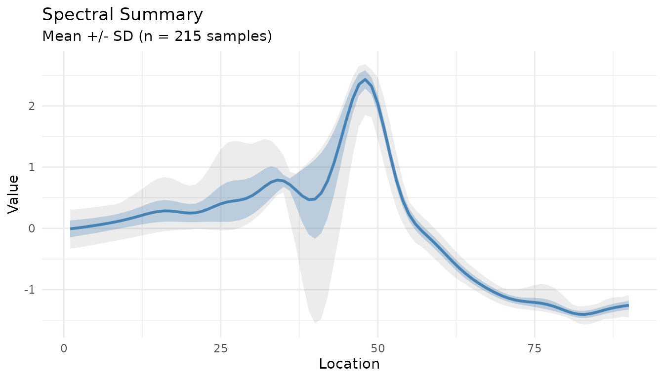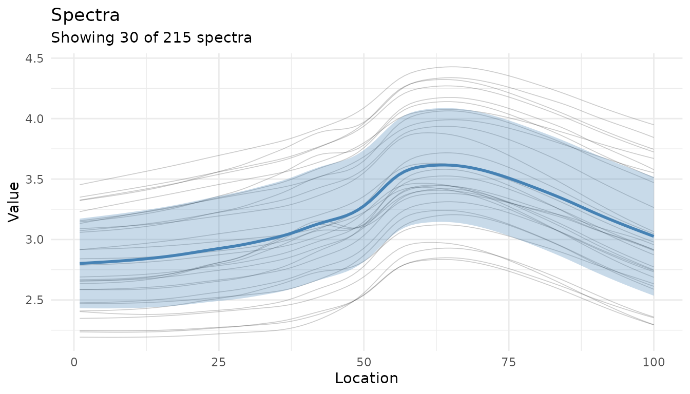 autoplot(baked$.measures, summary = TRUE, max_spectra = 30, alpha = 0.2)