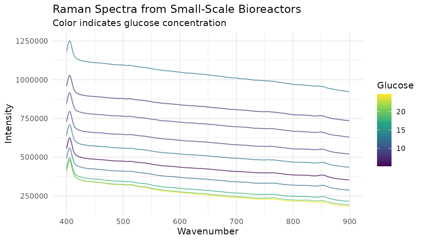 This vignette demonstrates a complete chemometric modeling workflow using measure. We’ll predict glucose concentration in bioreactors using Raman spectroscopy data.