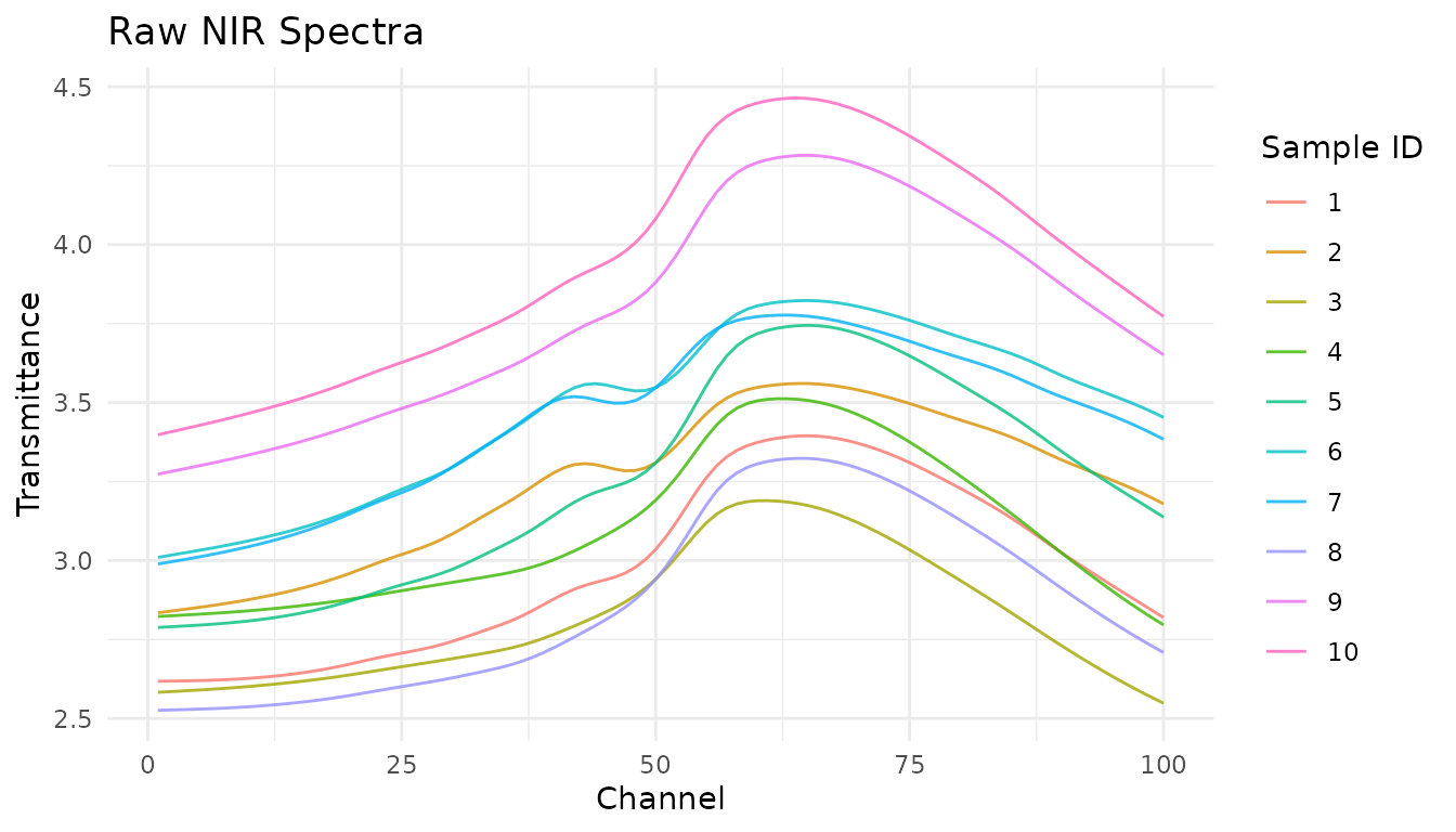 #> # ℹ 21,490 more rowsThe data is in “long” format where each row represents one measurement at one channel for one sample. Let’s visualize a few spectra: