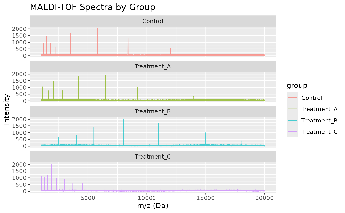 Simulated MALDI-TOF (Matrix-Assisted Laser Desorption/Ionization Time-of-Flight) mass spectrometry data for demonstration of mass spectral preprocessing. The dataset represents protein/peptide analysis from four experimental groups with four replicates each.